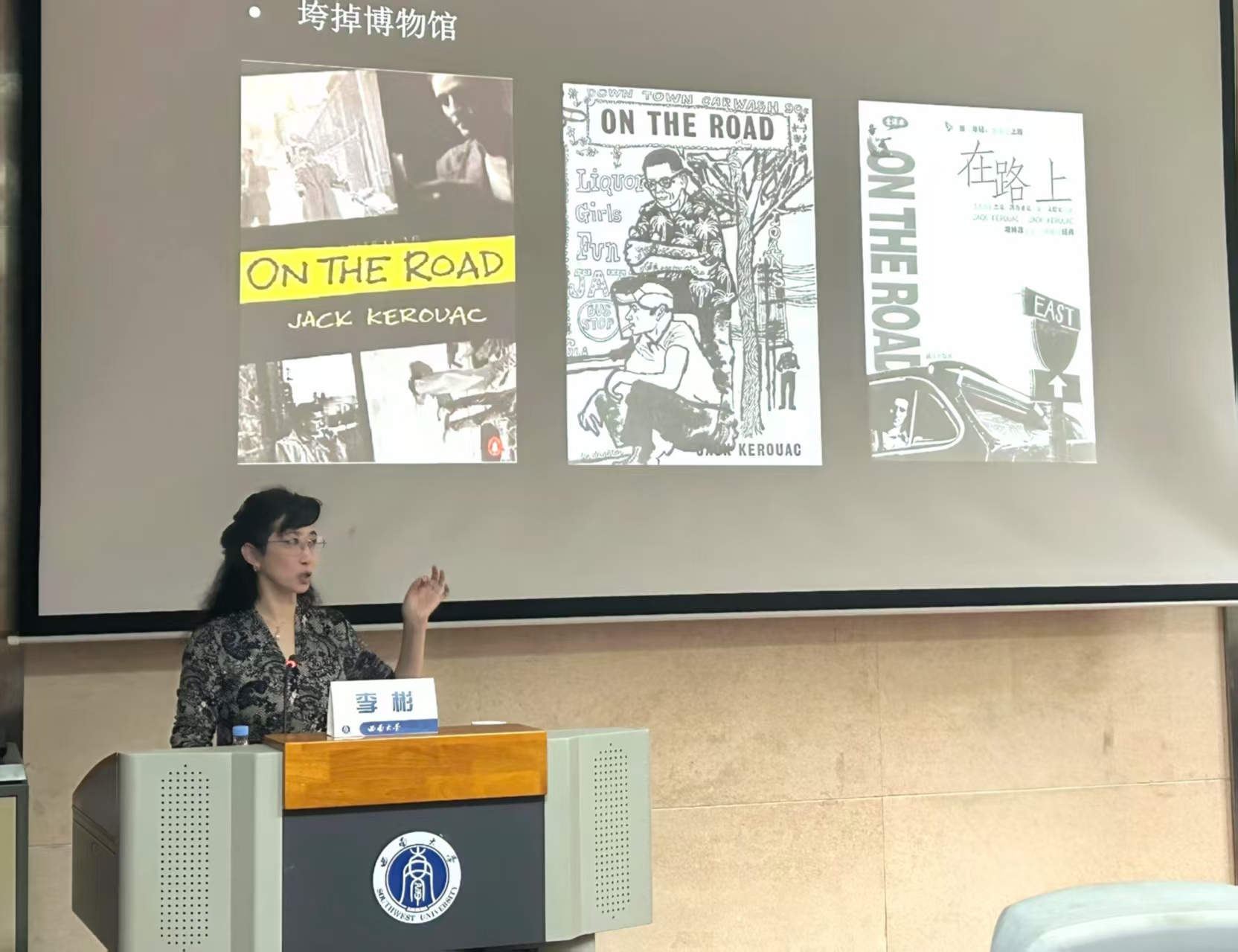 为便于听众直观地体验,李彬展示了大量一手资料,包括她在美国实地拍摄的66号公路影像、鲍勃·迪伦以公路为主题的油画作品,以及“垮掉的一代”代表作《在路上》的多种版本。丰富的案例生动地展现了这种反叛如何在艺术领域多元迸发,公路电影在此意义上成为集大成者。她特别强调,公路片中“上路”的行为,本质上是一种对“家”所代表的既定秩序和主流文化的疏离、出走甚至决裂。