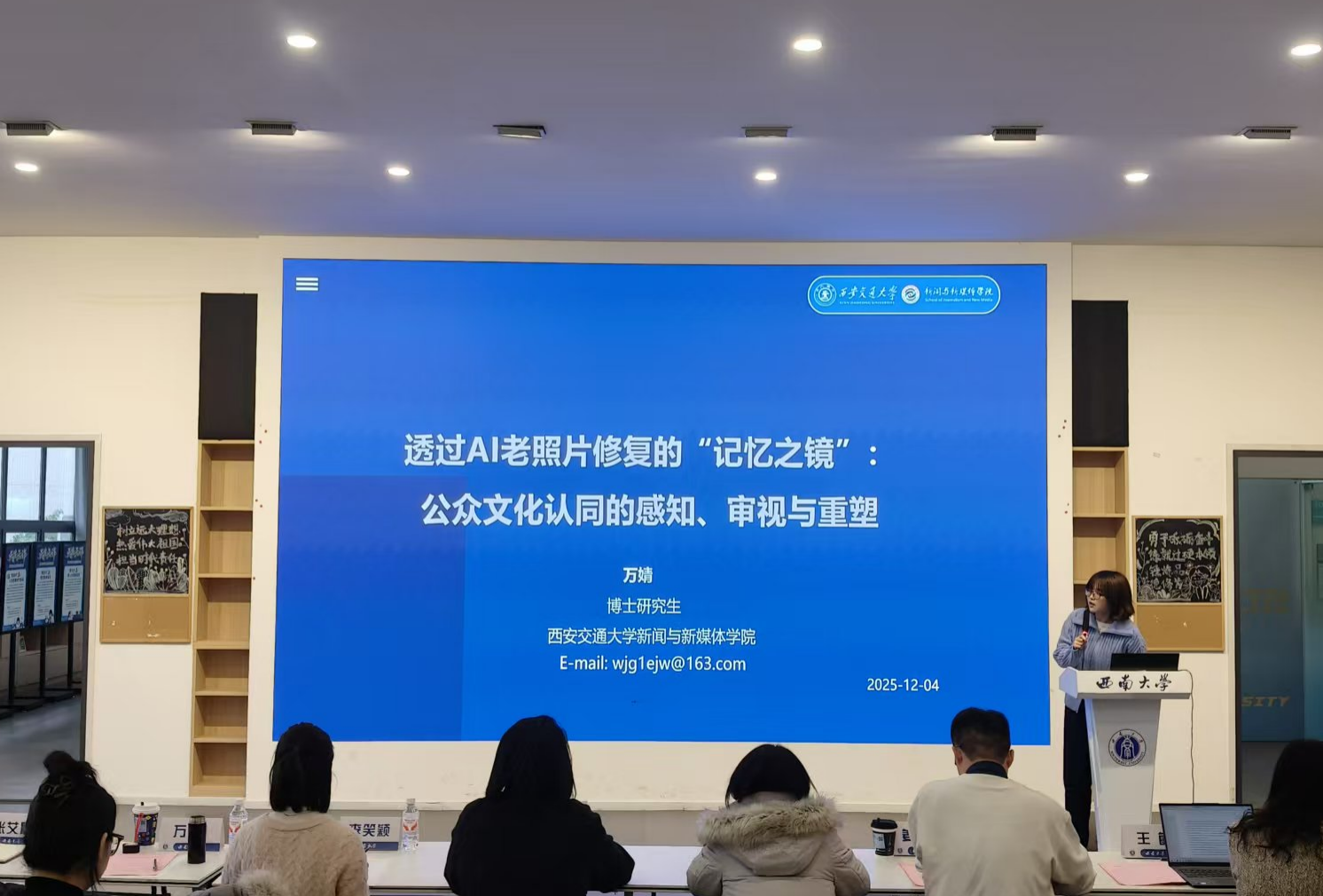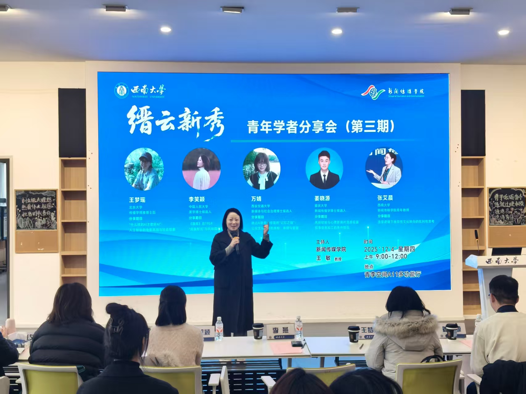 2025年12月4日上午,嘟嘟成人网 “缙云新秀”青年学者分享会第三期在青李空间A11成功举行。本期分享会邀请北京大学传播学博雅博士后王梦瑶、中国人民大学美学博士候选人李笑颖、西安交通大学新媒体与社会治理博士候选人万婧、重庆大学新闻传播学博士候选人姜晓源、嘟嘟成人网 青年教师张艾晨担任主讲嘉宾。会议由嘟嘟成人网 王敏教授主持,嘟嘟成人网 党委书记李燕及部分学生到场参与。