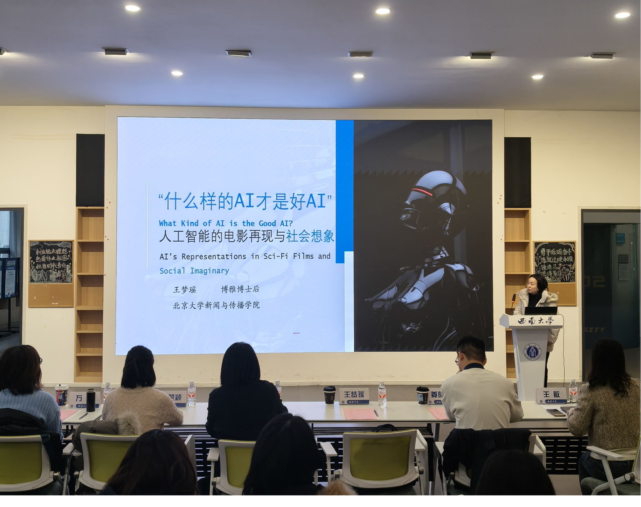 活动伊始,围绕《“什么样的AI才是好AI”:人工智能的电影再现与社会想象》这一主题,北京大学传播学博雅博士后王梦瑶从社会想象概念出发,对近百年间经典科幻电影中的AI角色进行了分析,总结出人类对AI的四种想象类型。同时,她指出,大众对AI的社会想象仍以人类中心主义为出发点,电影中“好的AI”往往被塑造为具有情感但自主性有限的服务者,这折射出技术普及过程中人类社会存在的深层焦虑。